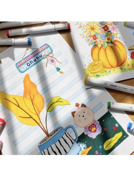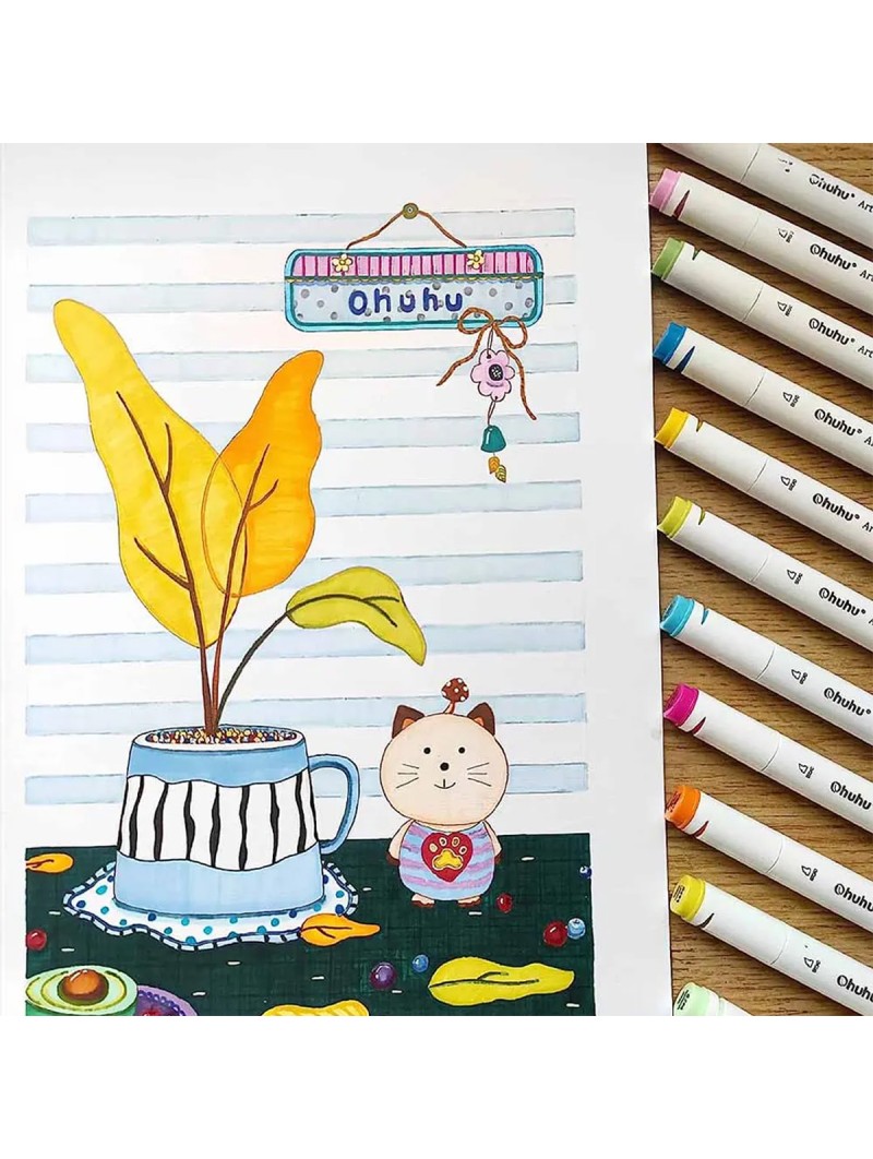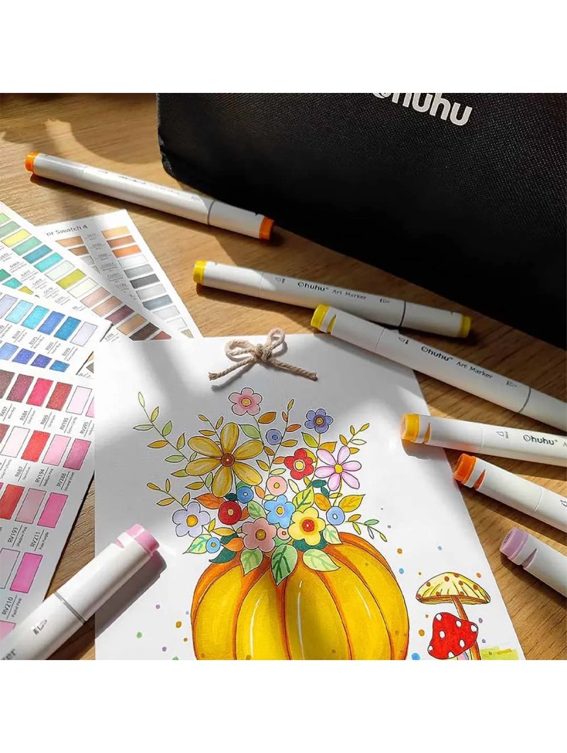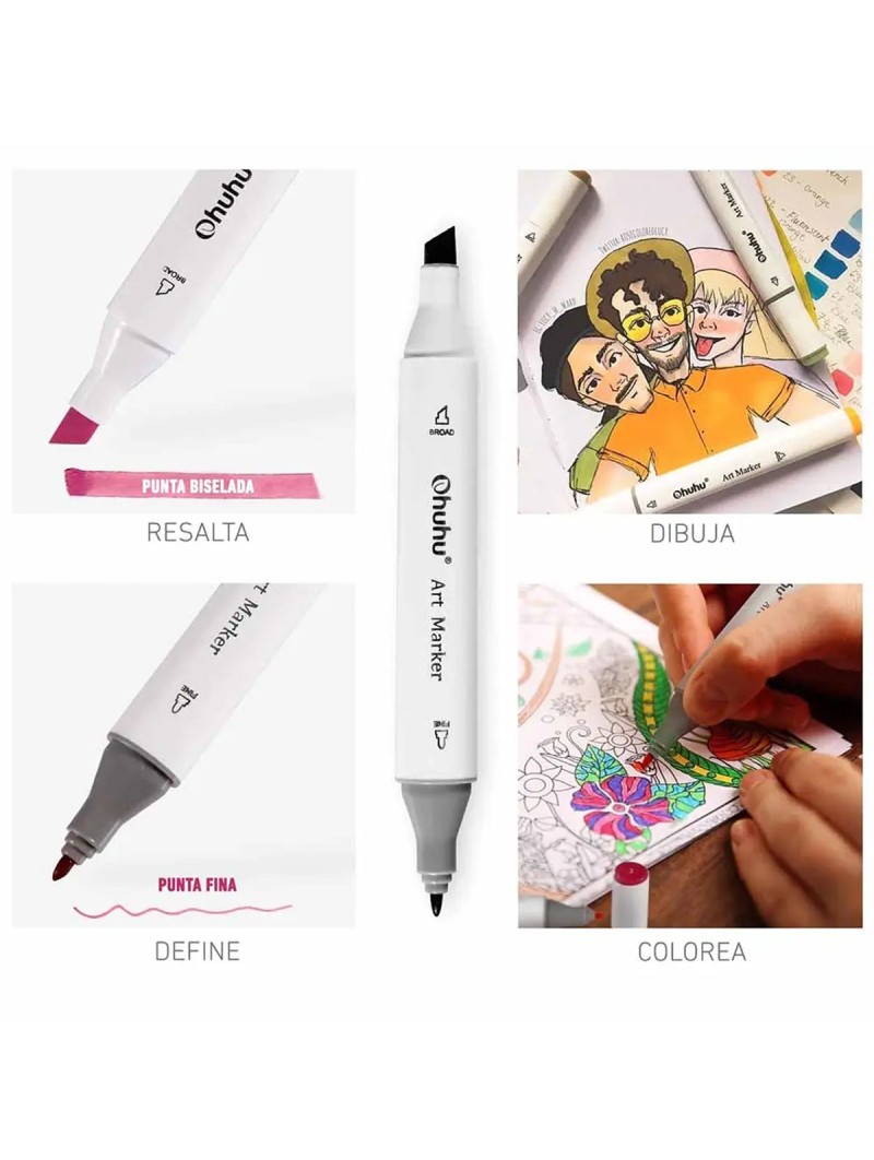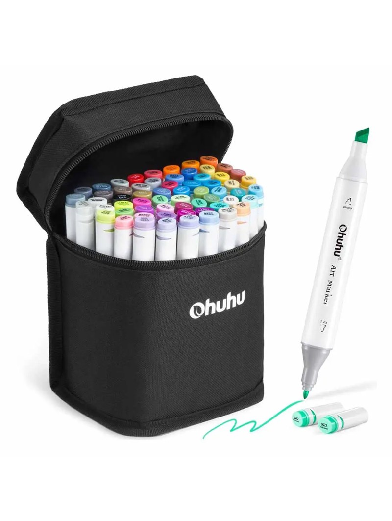 Descubre el set Ohuhu Oahu Set 60 Marcadores de Alcohol + 1 Blender, perfecto para ilustradores y artistas. Con punta doble (fina y biselada), estos marcadores ofrecen trazos precisos y cobertura uniforme. Su tinta a base de alcohol es de secado rápido, resistente al agua y se mezcla sin manchas.