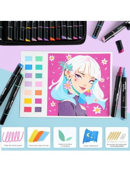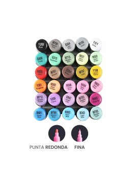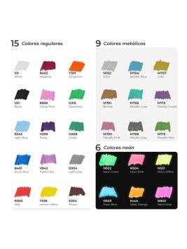 - Incluye 15 colores base, 9 colores metálicos y 6 colores fluorescentes.