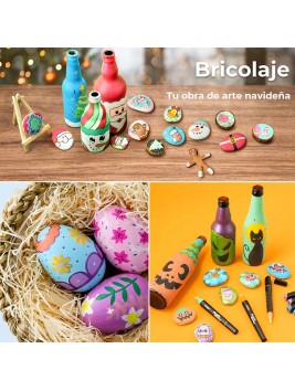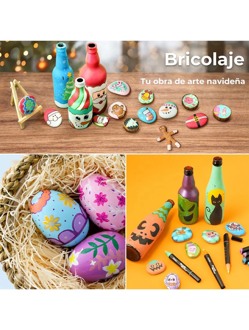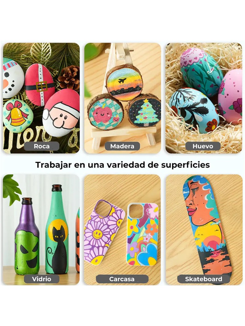 Con estos Marcadores puedes dibujar en muchas superficies, como rocas, piedras, madera, tela, cerámica, tazas, vasos, plástico, papel, huevos, lienzos y mucho más. Su tinta es resistente al agua y al sol, por lo que puedes crear obras maestras de arte que nunca se desvanecen.