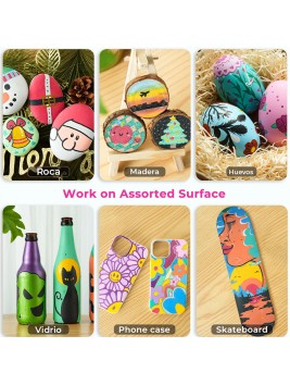 Con estos Marcadores puedes dibujar en muchas superficies, como rocas, piedras, madera, tela, cerámica, tazas, vasos, plástico, papel, huevos, lienzos y mucho más. Su tinta es resistente al agua y al sol, por lo que puedes crear obras maestras de arte que nunca se desvanecen.