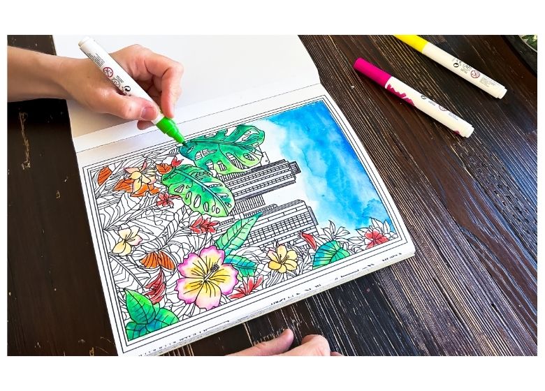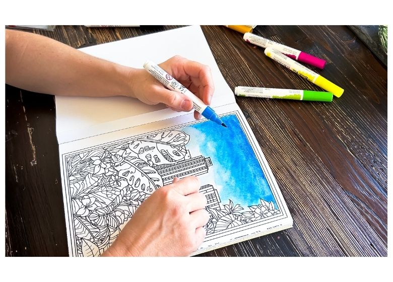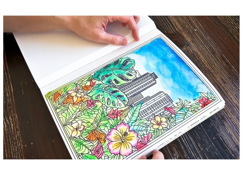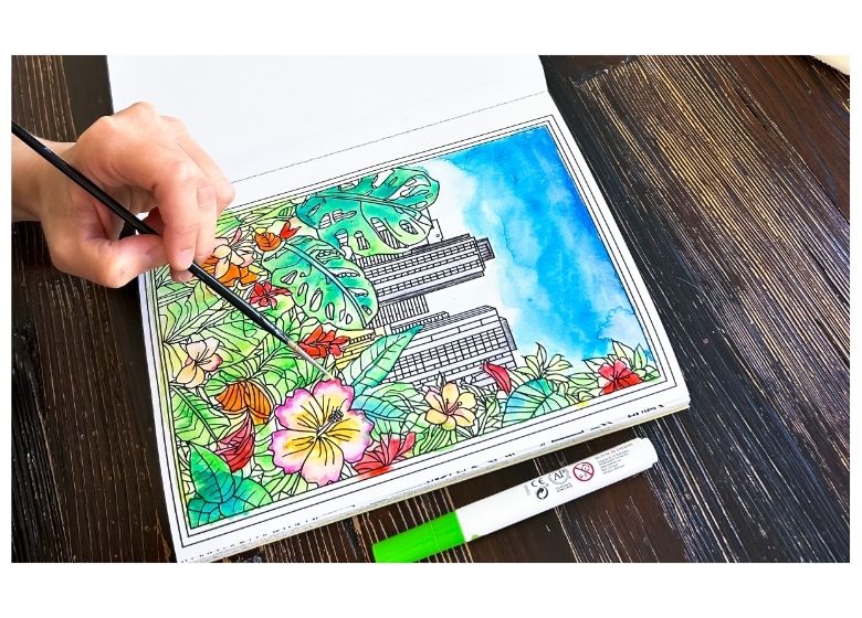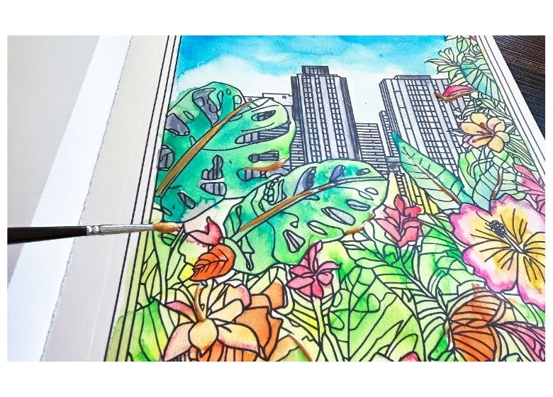 Comienza coloreando las áreas grandes, como fachadas, cielos o calles. Puedes trabajar con marcadores o acuarelas, según el efecto que quieras lograr.