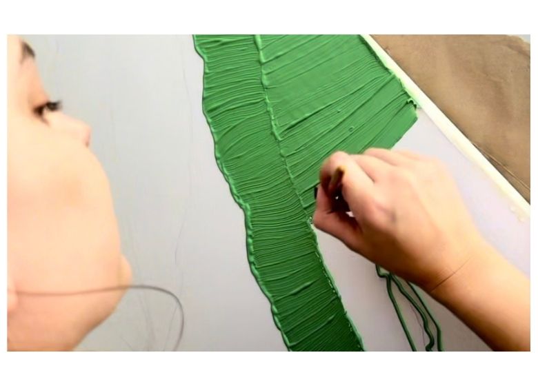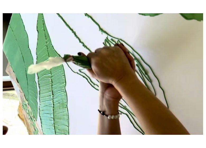 Aplico la pasta con espátulas o pinceles según el diseño. No sigo patrones, por eso cada obra es única. En este caso utilicé pincel plano y abanico para trabajar las hojas, además de manga para definir bordes.