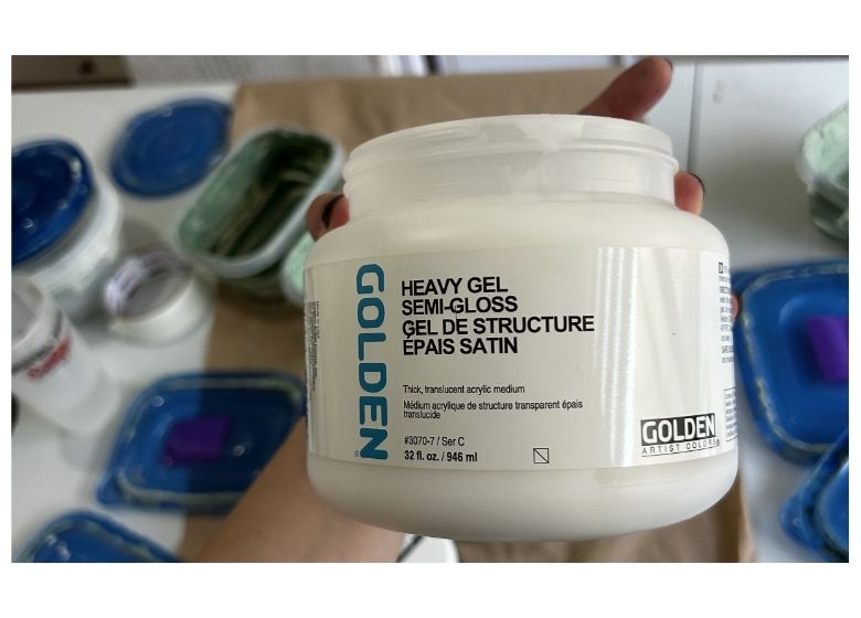Para cada cuadro utilizo mi “pasta maestra” (que hago yo, por supuesto, utilizando diferentes materiales para llegar a la textura deseada; la receta es secreta). Pero les puedo decir que la joya de la corona es el medium Heavy Gel Gloss de Golden. Estos geles están diseñados para espesar pinturas, lo que en mi caso es clave: extiende los colores y permite que la pasta se adhiera bien con los acrílicos sin alterar los tonos ni las mezclas.