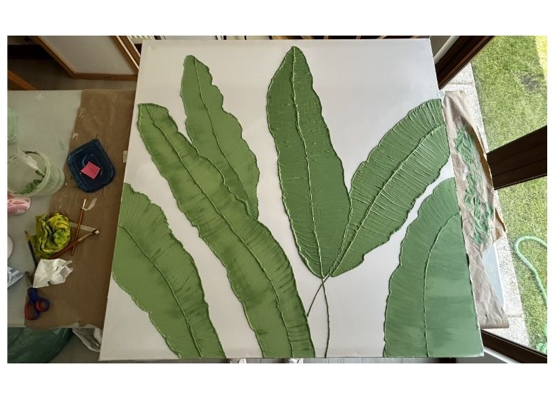 Todas mis obras comienzan con una intención: un color, una emoción, un espacio o un encargo. En este caso, con su dueña fuimos intercambiando ideas hasta llegar a una propuesta en tonos verdes, muy natural, inspirada en hojas de banano.
