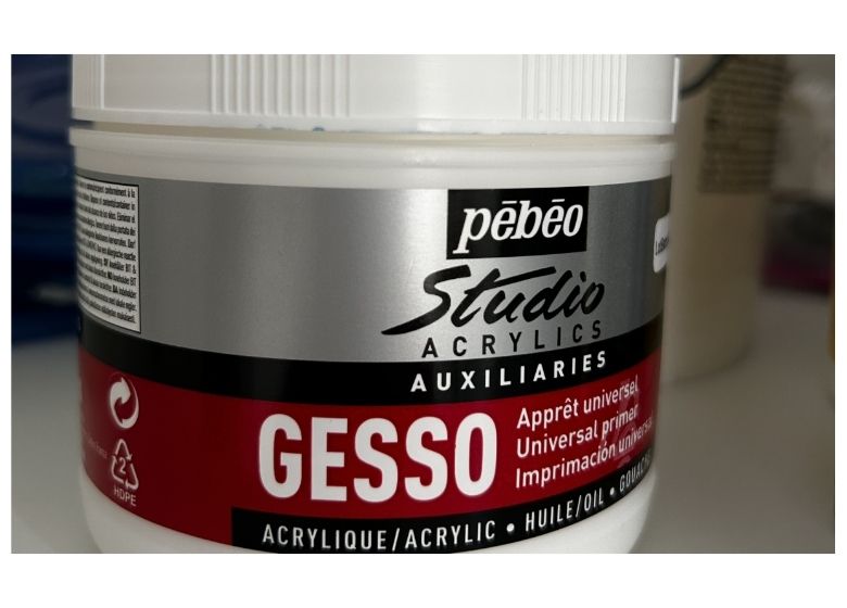- Gesso (Pebeo): El gesso es una base preparadora que se aplica sobre el bastidor antes de trabajar. Su función es sellar la superficie, mejorar la adherencia de los materiales y evitar que la pintura o la pasta se absorban de forma irregular. En mis obras lo utilizo para crear una base uniforme y más resistente, lo que ayuda a que la textura se adhiera mejor y el resultado sea más duradero y profesional.