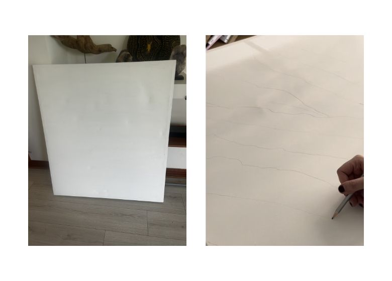 Se define la composición, el movimiento y la distribución. Se aplica gesso y acrílico blanco como base, y se protegen los bordes con masking tape.