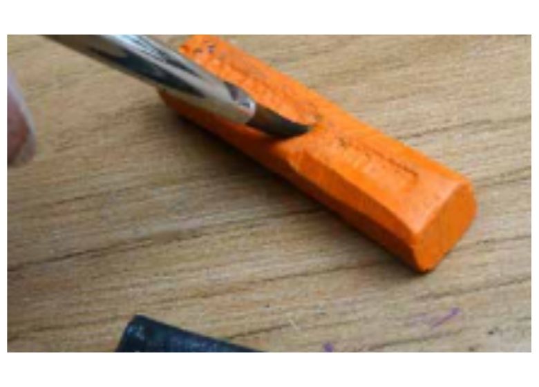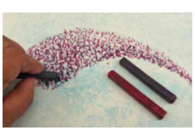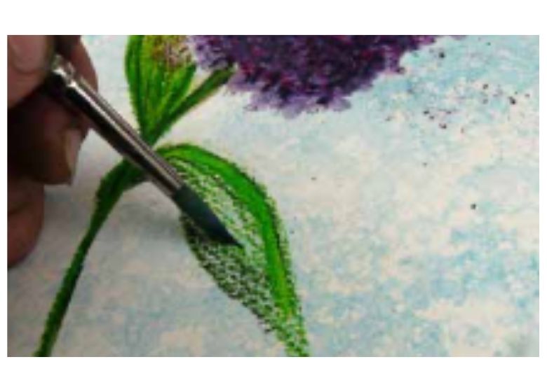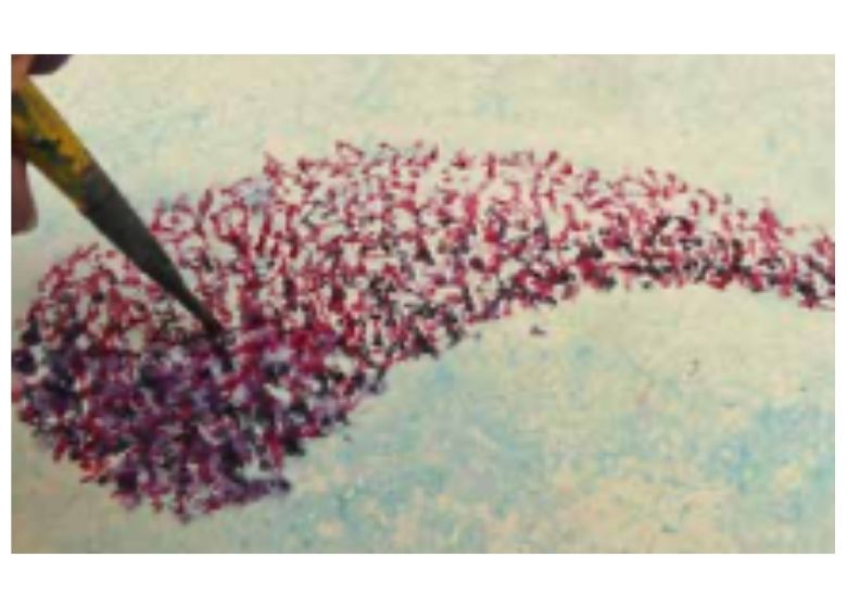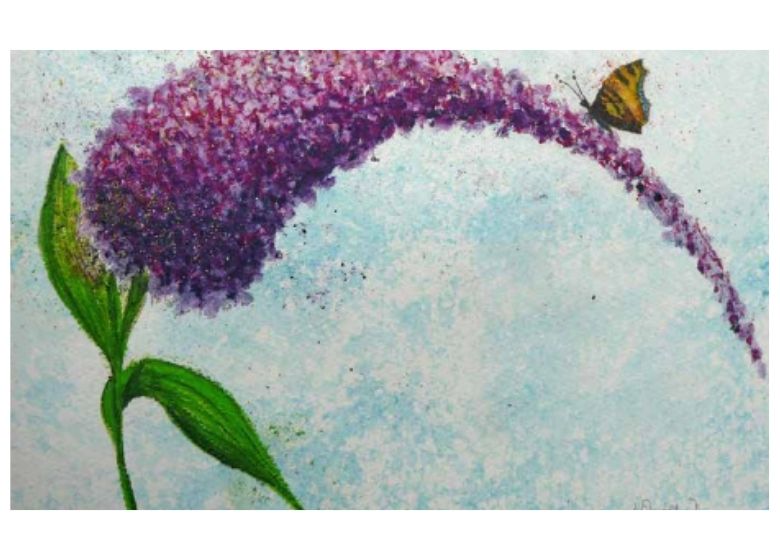 Después, utilizando el extremo de un bloque, apliqué firmemente puntos de color en la zona donde quería que estuviera la cabeza de la Buddleia. Trabajando con tres colores, de claro a oscuro, creé luces y sombras a lo largo de los bordes para dar forma y tono a la flor.