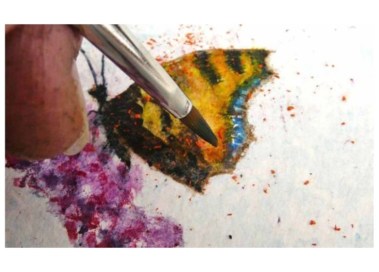 Esto me permitió pintar con mayor precisión y conseguir pigmentos intensos, perfectos para una mariposa tan colorida. Para terminar, raspé unas pequeñas motas naranjas alrededor de la mariposa.