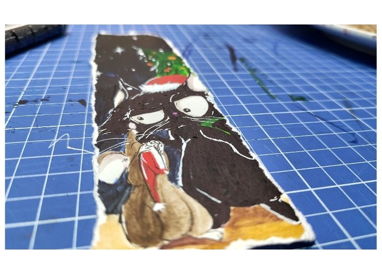 Además, con una mezcla de gris de Payne, amarillo y rojo, hago un marrón claro con el que pinto al ratón que acompaña a nuestro peludo y enojado amigo. También, en este paso, agrego unas sutiles sombras a los ojos de nuestro gato usando el marcador al alcohol Copic.