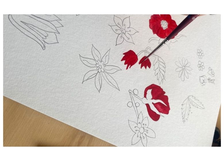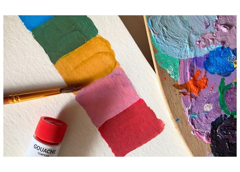 2. Elegir paleta de colores: Selecciona los colores que vas a usar y haz pruebas en el mismo papel para ver cómo se ven al secarse. Si usas más agua, el color será más transparente; si usas menos, será más cubriente.