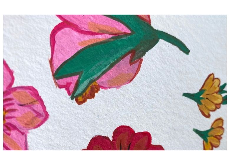 El gouache es una pintura a base de agua similar a la acuarela, pero opaca y cubriente. A diferencia del acrílico, no es permanente ni resistente al agua. Y comparado con la témpera escolar, el gouache tiene mayor pigmentación y un acabado más profesional. Su textura y acabado mate lo hacen ideal para digitalizar ilustraciones, crear textiles, papelería o accesorios.