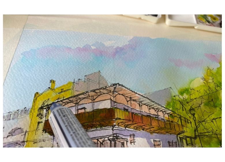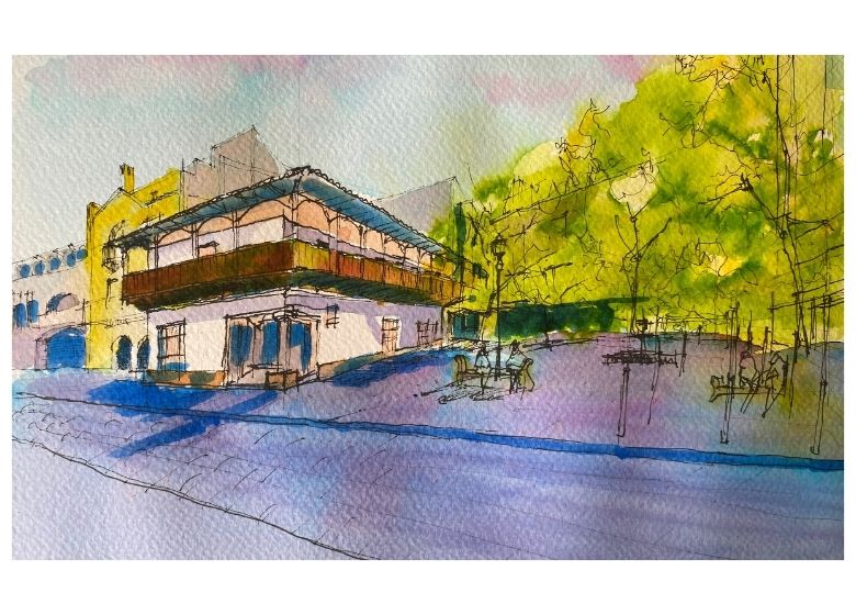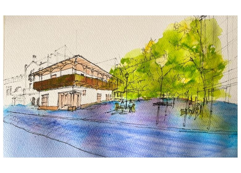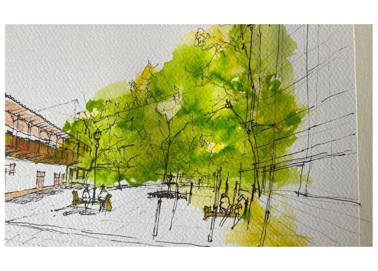 Este trabajo nos recuerda que el urban sketching combina observación, técnica y paciencia. Para lograr un resultado armonioso y con profundidad, es fundamental dedicar tiempo a observar los detalles del lugar, comprender la perspectiva y la relación entre los elementos que componen la escena.