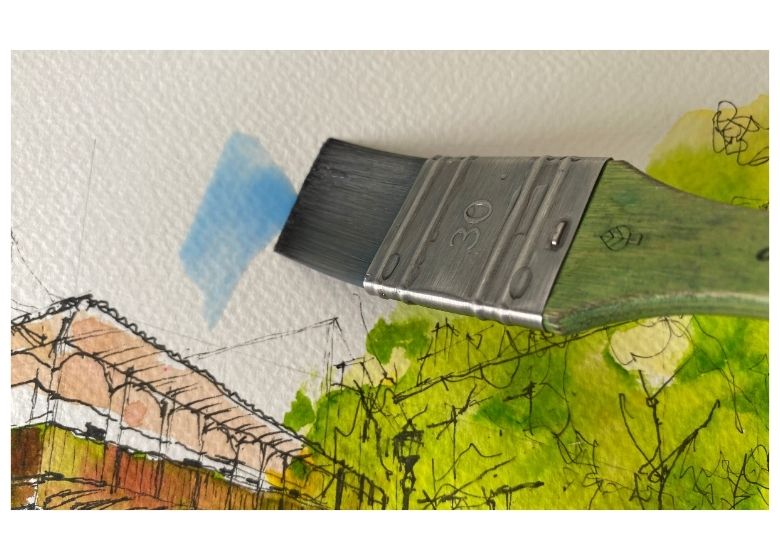 Luego, diluí el mismo color con agua y lo apliqué con un pincel ancho para el cielo, dejando algunas zonas más cargadas sobre los volúmenes arquitectónicos.