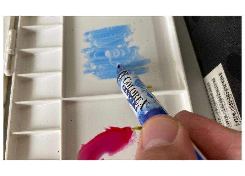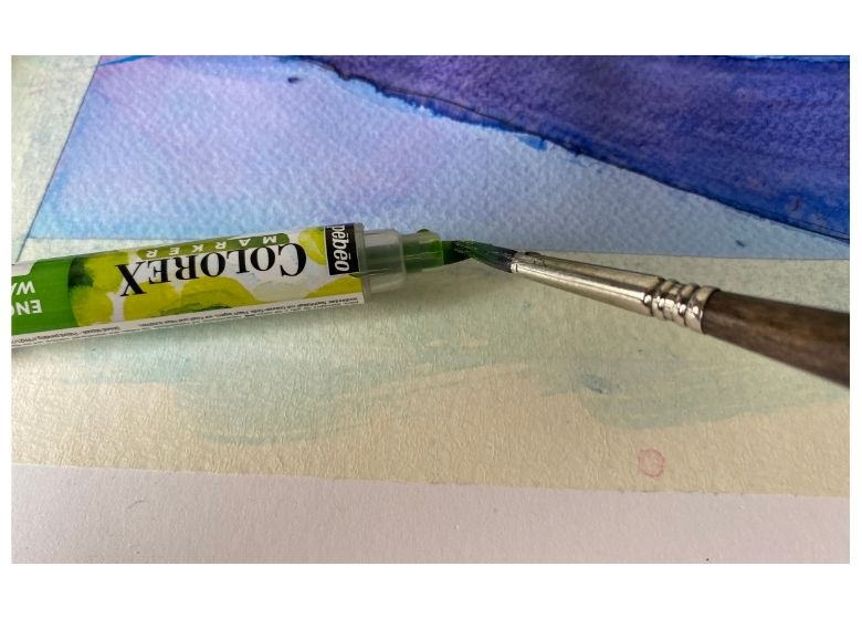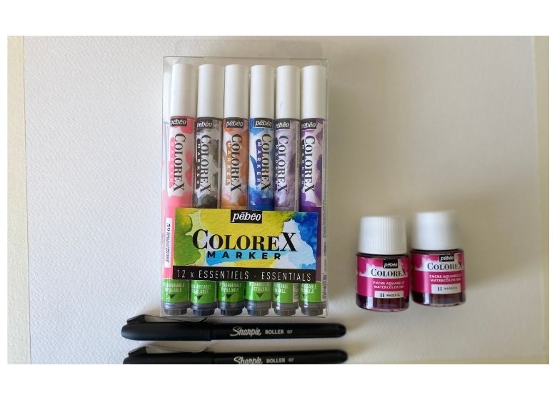 Inicié la pintura con los materiales Colorex de Pebeo: tintas de acuarela en frasco y marcadores Colorex con punta de pincel.