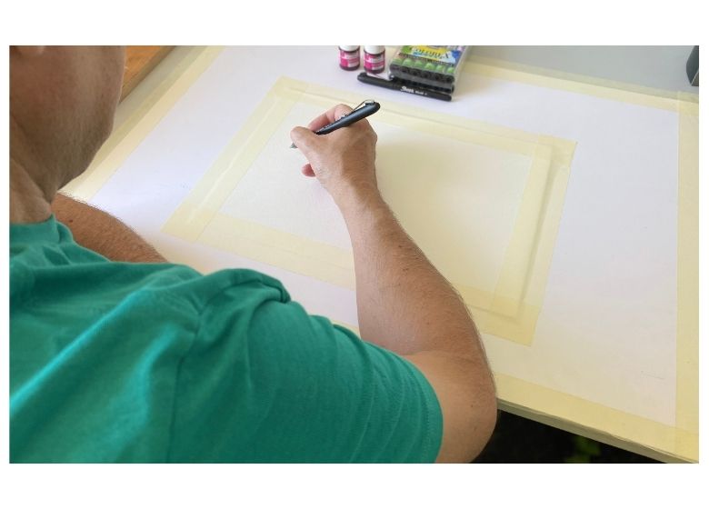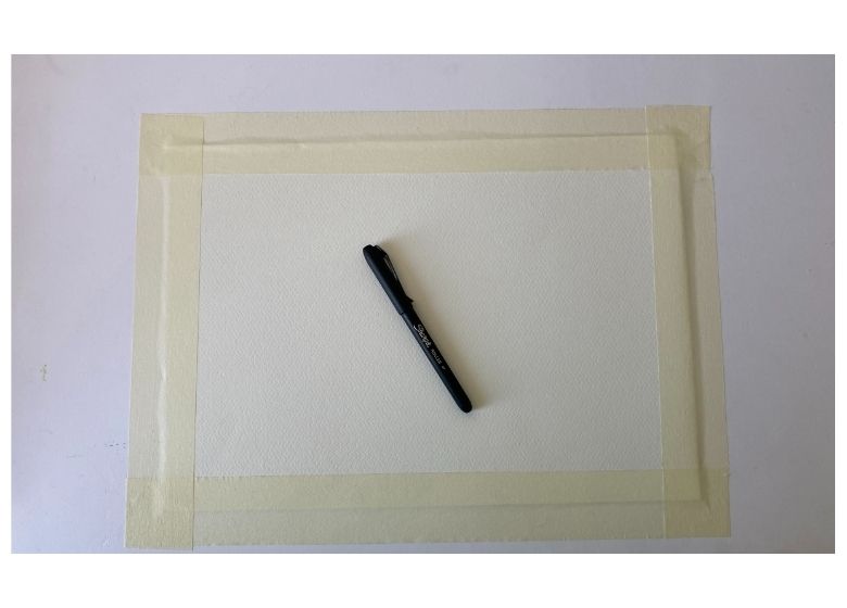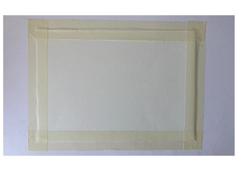 Utilicé una hoja blanca para acuarela de 300 g/m², 100% algodón, de 26 x 38 cm, ideal para trabajar con agua y pigmentos sin deformar el papel. Luego, fijé la hoja a la mesa con cinta de enmascarar en todo el perímetro, lo que además crea un margen blanco que enmarca el resultado final.