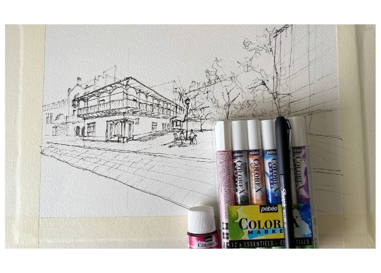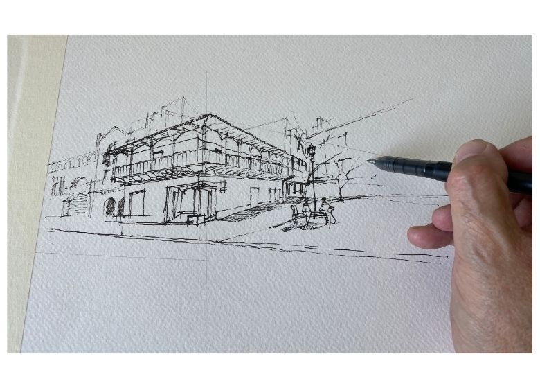 Comencé directamente con un lápiz Roller Sharpie de tinta negra, aunque también podría hacerse un boceto previo con grafito 4B. Me enfoqué en la perspectiva, donde un punto de fuga se encuentra al fondo de la plaza y el otro hacia el costado izquierdo de la Posada.