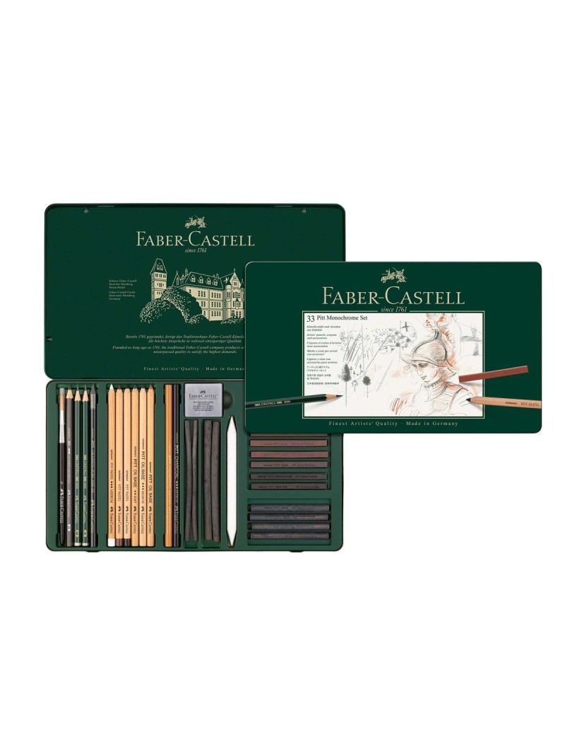 El kit de 33 piezas en estuche de metal con calidad profesional contiene los colores monochrome clásicos - negro, blanco, sanguina y sepia - pueden encontrarse a diario en casi cualquier clase de arte, ya que hacen que los dibujos cobren vida con vitalidad y expresión.