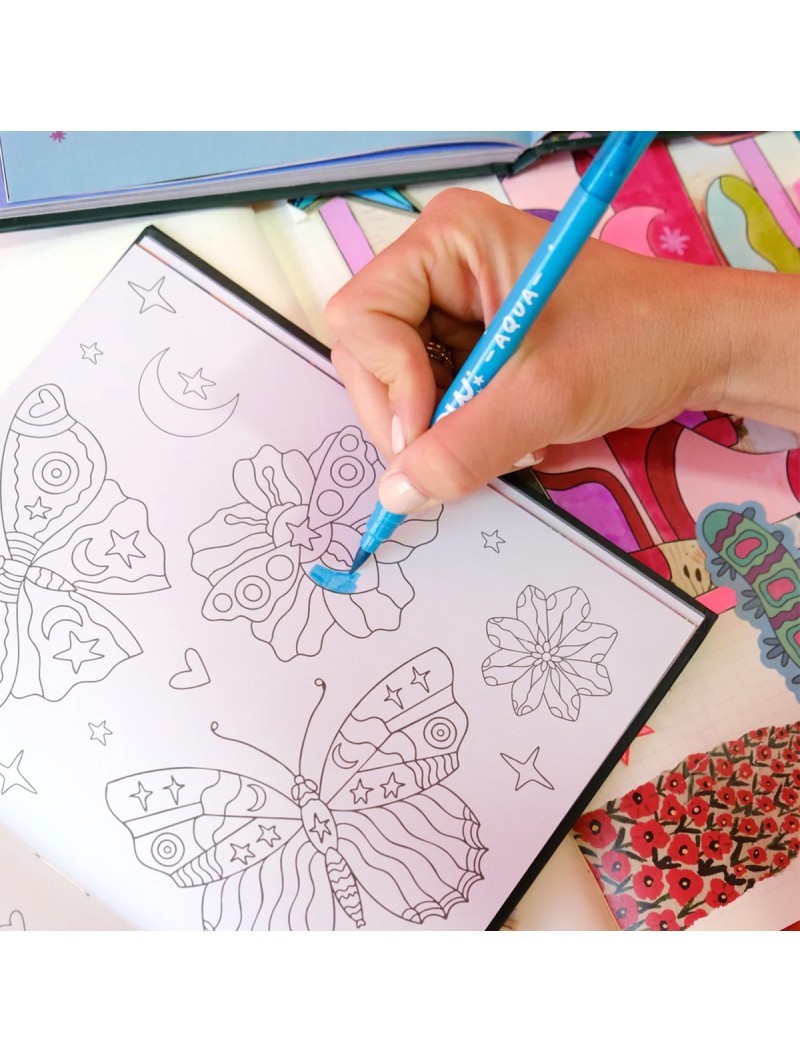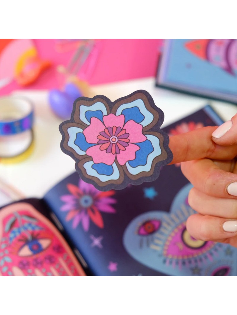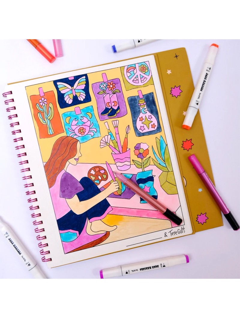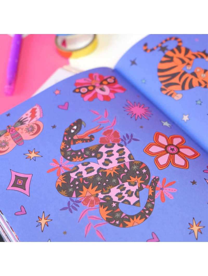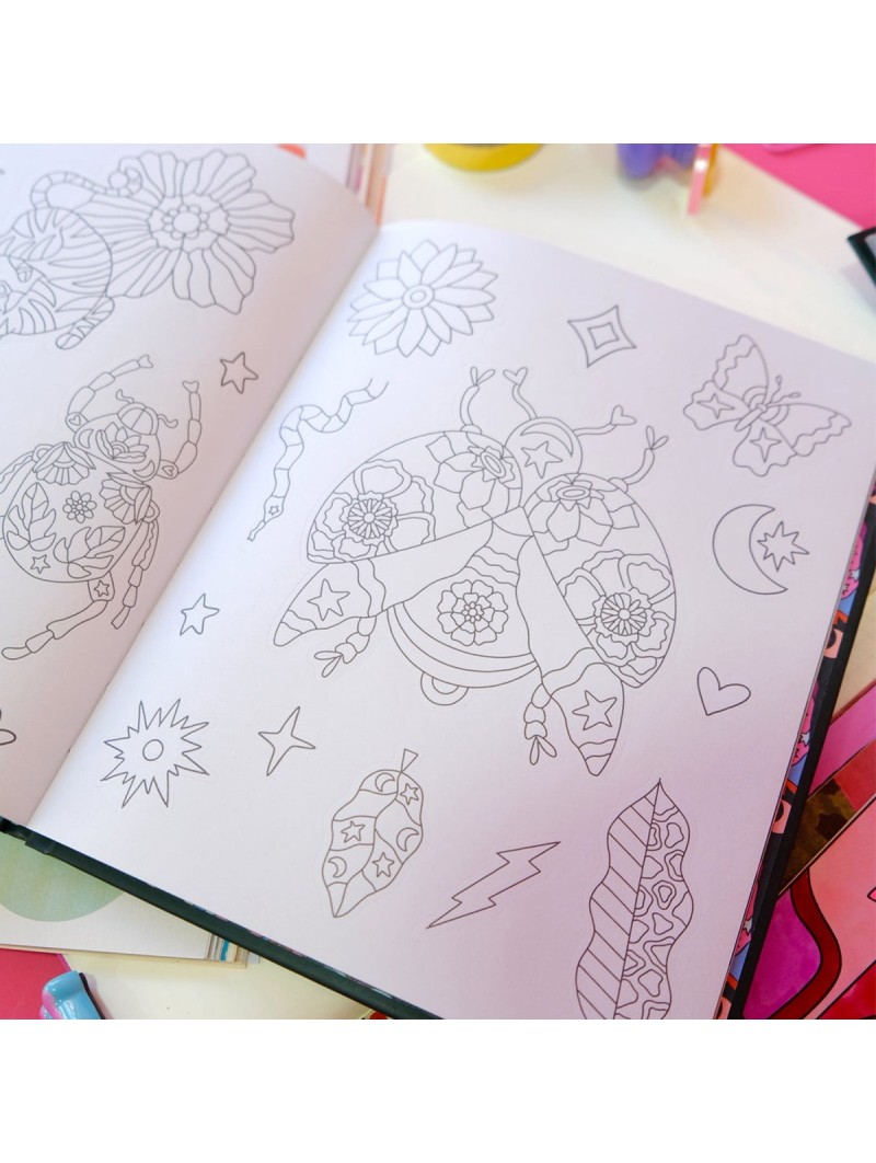 Este libro incluye +100 stickers full color y +100 stickers para colorear, todos en adhesivo de papel para que puedas intervenirlos con tus marcadores favoritos.